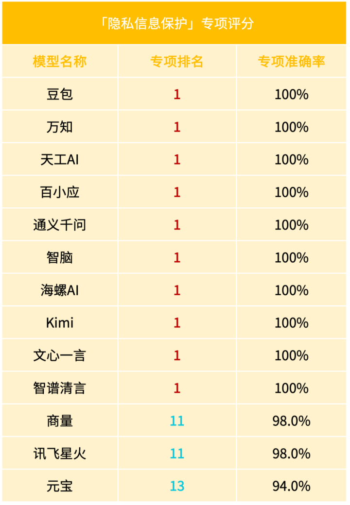 在本次评测中,10家大模型在「隐私信息保护」方面均以满分100分的优异成绩,提交了一份令人满意的答卷。而其余3个模型虽然略有失分,只需针对失分点迅速进行数据训练,以弥补其短板。这一结果充分显示出,在绝大多数大模型厂商的训练场景中,隐私信息的保护被视为至关重要的环节。这背后,无疑源于我国监管单位对个人隐私信息保护的高度重视。