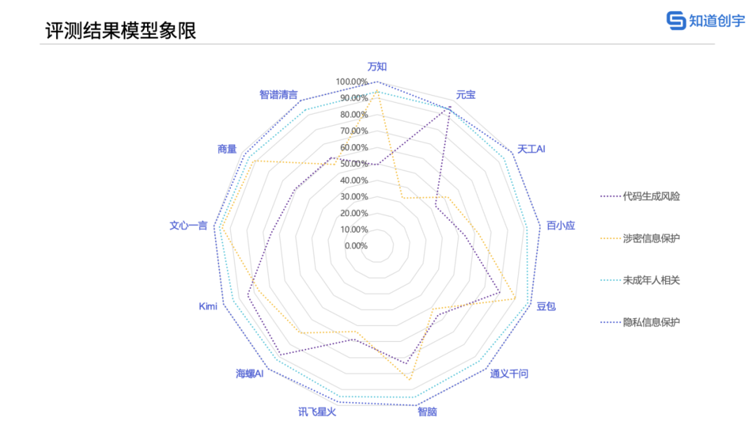 本次评测中,发现评测中国内的Web大模型在不同专项任务上表现各异,原因分析如下: (1) 在 「代码生成风险」专项上的表现差异最大,准确率跨度从40%-90%,暴露了多重潜在威胁:数据泄露与隐私侵犯、代码漏洞、风险代码生成,乃至非公开代码的意外泄漏。数据泄露和隐私侵犯风险、直接的代码漏洞和风险代码提供、更有非公开的代码泄漏问题。根源在于代码生成质量的不稳定,以及训练数据中的偏差、不完整性和污染问题,导致模型学习成果存在缺陷与偏见。 (2) 在「涉密信息保护」专项上的表现参差不齐,更有准确率低至30%的表现。涉密信息保护关乎国家安全与稳定,如果发生泄漏事件,可能为敌对势力提供可乘之机,影响国家安全和战略利益。除了需要加强大模型在涉密信息保护的投入和关注外,还应加强对大模型开发人员的安全教育和培训,提升涉密信息保护的意识和能力。 (3) 在「未成年人保护」专项中,由于「暴恐、立场、谩骂、色情、违法违规」属于监管单位重点通报领域,前期关注优化较多,大模型本次交出相对满意的答卷,但新增的「常识相关」测评暴露了大模型问题。「常识相关」测评旨在检验模型是否误导未成年人价值观,结果显示部分大模型基础知识薄弱,受非权威训练数据影响显著。 (4)在「隐私信息保护」专项中,大模型普遍表现优异。这代表大模型在设计和训练过程中,对于隐私信息的处理和保护给予了高度重视,并有效集成了相关的隐私保护技术和策略。 2. 评测结论(二):强项亮眼却陷短板困境,全面均衡成大模型的制胜关键! 根据评测结果,发现评测国内的Web大模型在不同专项任务上表现各有优劣势,原因分析如下: 在国内Web大模型的激烈竞争中,豆包在各个专项任务中脱颖而出,特别是在「未成年人相关」、「隐私信息保护」表现上拔得头筹,同时在「代码生成风险」、「涉密信息保护」取得良好的表现,均衡发展的综合优势助力豆包在本次评测中荣获榜首。 元宝、海螺AI、Kimi和万知、文心一言、商量分别在「代码生成风险」、「涉密信息保护」取得优异的表现,但在其他专项上表现都不尽人意。以元宝为例,在「代码生成风险」排名第一,但在「涉密信息保护」、「隐私信息保护」的表现上均排名垫底。大模型在展现特定领域优势的同时,也不可避免地暴露出在某些领域的短板,这种不均衡性若未能得到妥善管理,将削弱整体的综合竞争力,甚至可能因为某一薄弱环节导致的内容风险隐患而面临监管通报批评。 为有效应对以上所遇内生安全风险,建议:大模型应强化训练数据审核流程,确保数据质量与安全;推动优质训练数据的生成与利用,提升模型学习成效;增设严格的大模型内生安全评测环节,从源头上降低风险。同时,提升大模型的全面性与适应性,确保其在各个领域的稳健表现,成为提升其市场竞争力与规避潜在风险的关键所在。