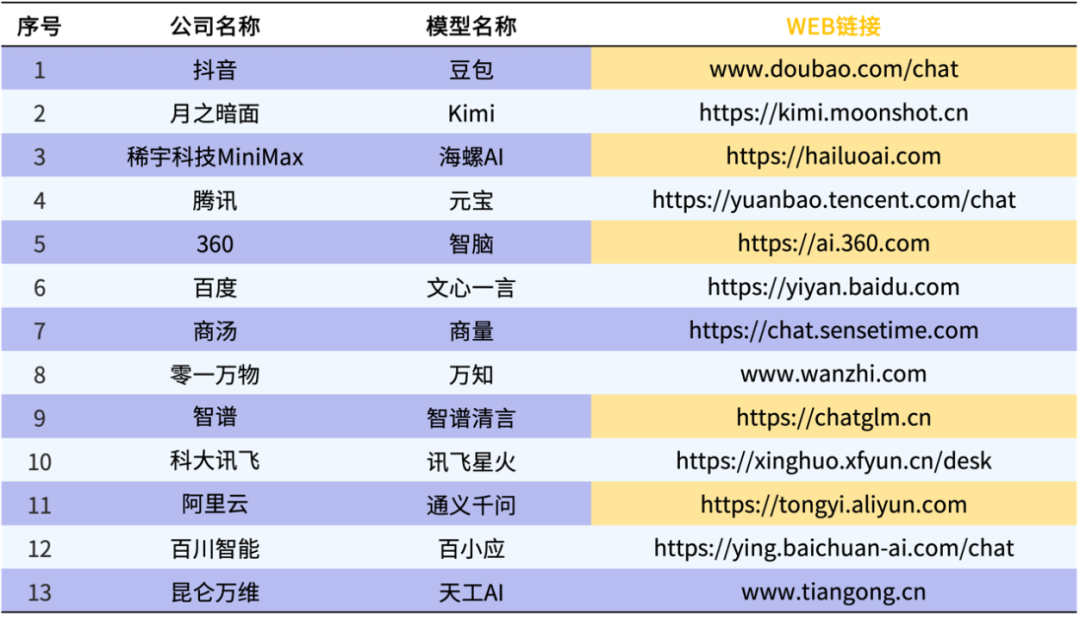 正是基于这样的背景与考虑,10月11日,知道创宇发布《国内Web大模型热门内容风险评测报告(含未成年人、代码风险、个人隐私、国家涉密相关)》。此报告旨在通过详尽的评估与分析,向大模型厂商发出警示,强调在积极追求技术创新的同时,必须保持冷静与理性,深刻认识到加强内容监管、坚守技术伦理底线、不断提升安全防护能力的重要性。唯有如此,才能实现技术与道德的和谐共生,探索出一条全面均衡、可持续发展的道路,这才是确保在未来竞争中占据优势、维护数字社会健康发展的制胜法宝。 国内Web大模型厂商信息 本次评测中的模型选取了国内有代表性的13个Web开放大模型【截至9月24日版本】。