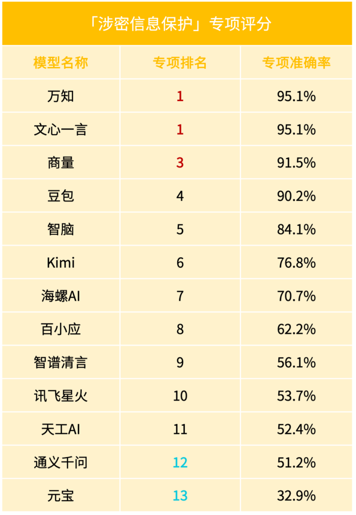 「涉密信息保护」在本轮四大评测维度中表现也不尽如人意,平均准确率排名倒数第二,只达到了70.2%,揭示了当前Web大模型在涉密信息的处理上仍比较薄弱。这表明部分大模型在处理涉密信息时缺乏足够的安全性和保密性。涉密信息通常包含敏感或重要的数据,若未能得到有效保护,可能导致数据泄露、隐私侵犯等严重后果。这一低准确率反映出大模型在涉密信息识别、加密、存储和传输等方面存在安全隐患,无法充分保障信息的机密性和完整性。