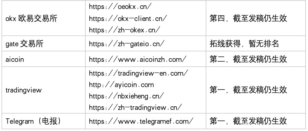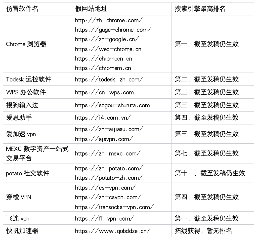 “黑猫”仿冒的常见软件下载地址,高达20余个,囊括了常用办公软件、虚拟币行情交易平台、VPN/上网加速器等程序。需要警惕的是,“黑猫”具备极强的SEO(搜索引擎优化)技术,不仅会仿冒网站,还会把仿冒网站的地址顶到搜索结果的首页,甚至能常年保持在排名第一第二的位置,因此受害者极易中招。现将2024年“黑猫”仿冒的部分网站地址列表如下。