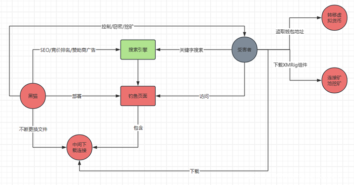 安装程序被受害者运行后,后门程序会窃取受害者虚拟货币钱包,浏览器信息,监听键盘等。如果受害者不具备盗币的可能,“黑猫”会释放XMRig挖矿木马组件进行挖矿。