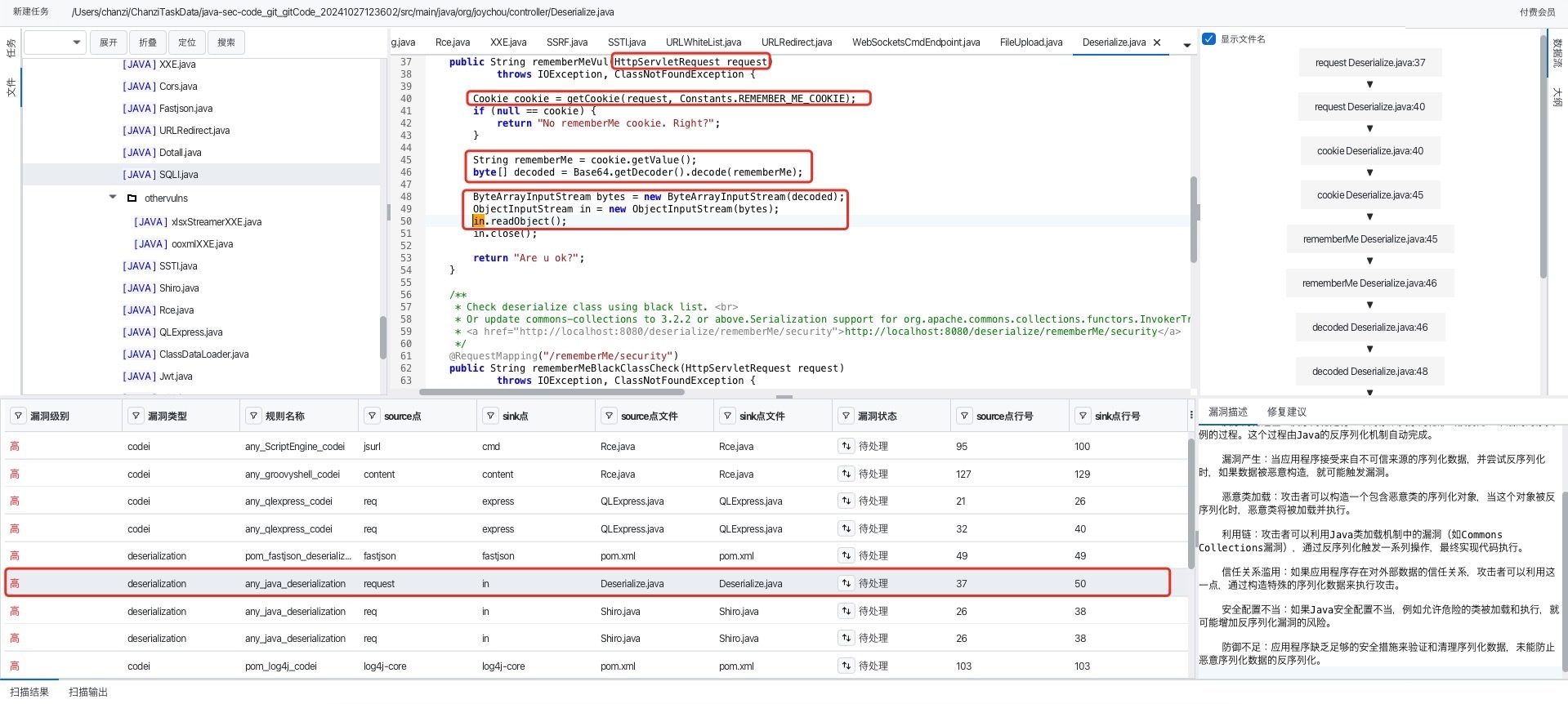 - any_java_deserialization.cypher // 数据流规则、Java 反序列化