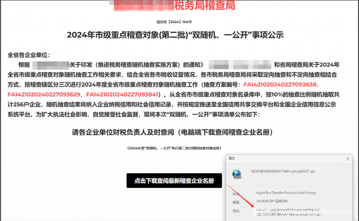 在钓鱼页面传播,攻击者则更倾向于针对企业职员进行定向投递。税务稽查类钓鱼页面通常是此类钓鱼攻击实施中的核心一环。攻击者一般通过聊天软件、邮件、短信等方式发送欺诈链接给用户,诱骗用户打开,进而下载木马。很多银狐木马在对抗过程中改用了网盘或云服务商提供的Object Storage Service (OSS)来挂载木马。这样也让防护人员很难根据站点IP或域名进行封禁或者溯源,而在木马下载链条中,只能对单个下载页面进行相对精准的定位和封禁。