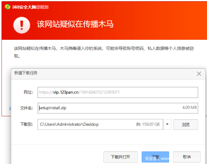 一旦有用户陷入误导,便会跟随虚假指引下载木马安装包,主动安装木马。这类投放方式面向的是普通大众,而虚假站点通常也是直接仿冒各类知名大站,普通用户往往难辨真伪。