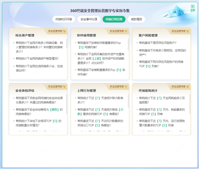 在AI大模型能力加持下,360终端All in One 5.0打造了覆盖八大痛点场景的多位一体解决方案,致力帮助广大政企机构在提升终端安全能力、安全运营效率的同时,实现低成本、高效能的数转智改。