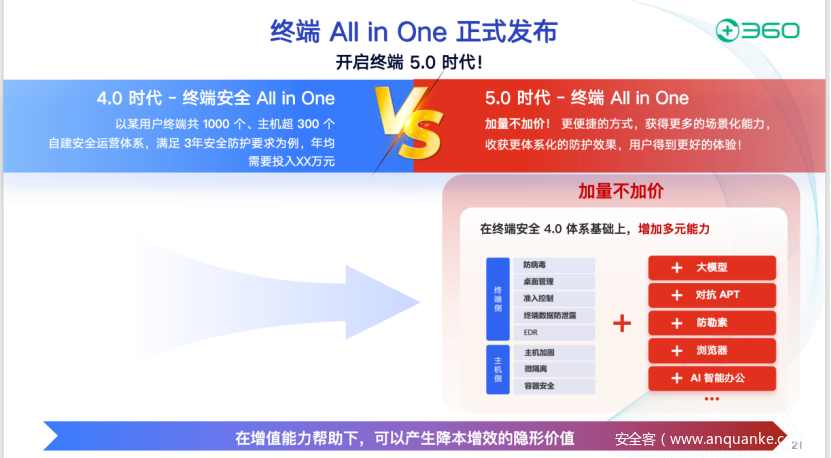 相比终端安全All in One 4.0时代,360提出的终端All in One 5.0,在4.0的基础上增加了大模型、对抗APT、防勒索、企业浏览器、AI智能办公等更贴合用户痛点的终端应用场景,加量不加价!