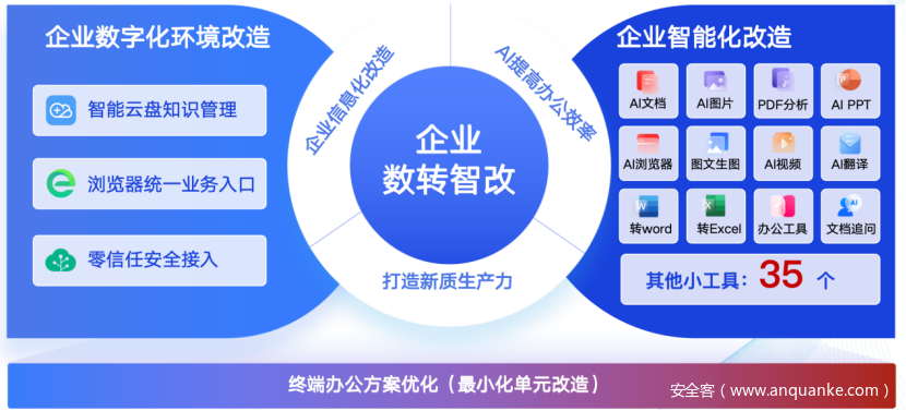 同时将AI文档、AI图片、PDF分析、AI PPT、文生图、AI视频、AI翻译等35款办公工具进行整合以场景化能力输出给用户,致力于以最低的成本赋能企业智能化改造,助力各行各业实现更智能、更安全、更高效的办公体验。