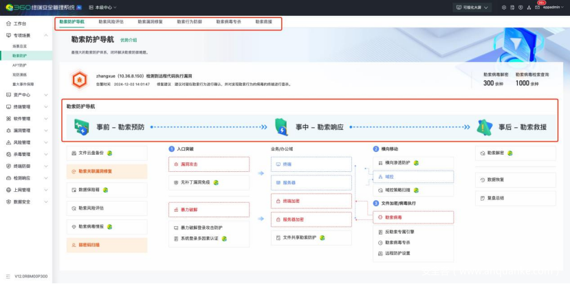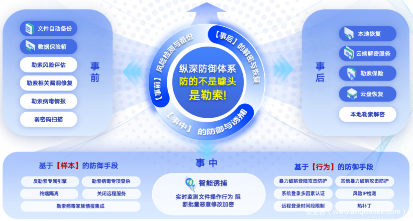 针对攻击路径愈发复杂且多变的勒索攻击,360终端All in One 5.0解决方案可围绕事前、事中、事后,提供文件自动备份、数据保险箱、云端解密、勒索保险、云盘恢复等能力,全面覆盖预防、防护与救援的全生命周期;