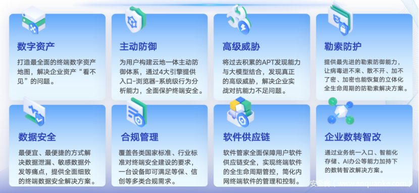 360基于服务百万企业客户的经验积淀,深度洞察终端安全建设的核心需求,提炼总结出数字资产“看不见”、被动防御不全面、高级威胁难对抗、勒索攻击难防护、数据泄露难掌控、合规管理需满足、软件供应链需保护、企业数转智改八大终端安全痛点场景。