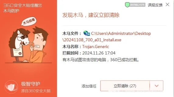 相信安全软件的判断,切勿轻易将报毒程序添加至信任区或退出安全软件。