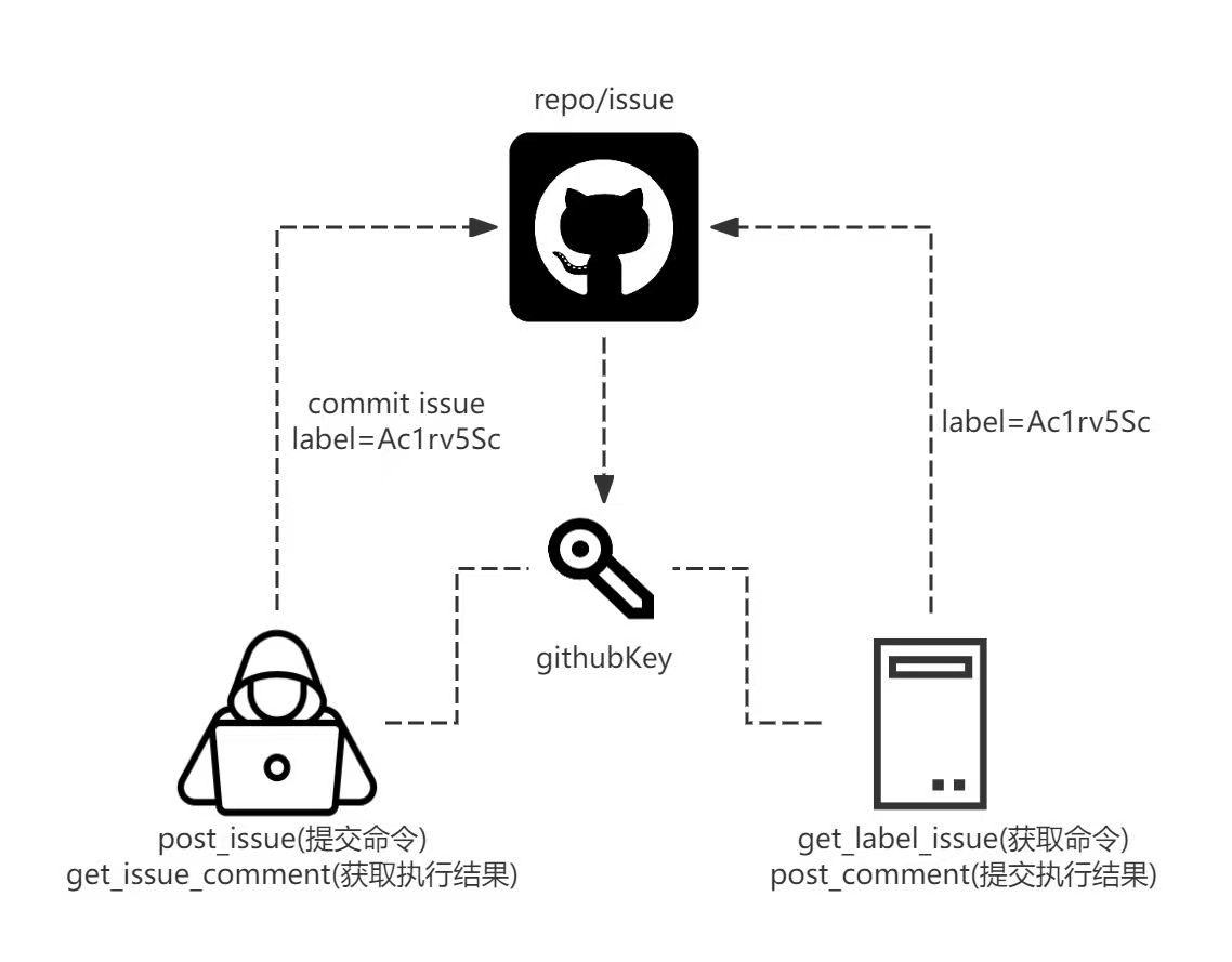 Github模块利用了github仓库自身的功能,巧妙的利用其功能特性,利用GitHub的Issue标签(labels)来区分上线主机,利用GitHub的Issue和Comment功能来下发命令和接收结果,implant通过调用GitHub API与私密仓库进行通信,攻击者利用Client可以直接对上线主机进行命令控制。