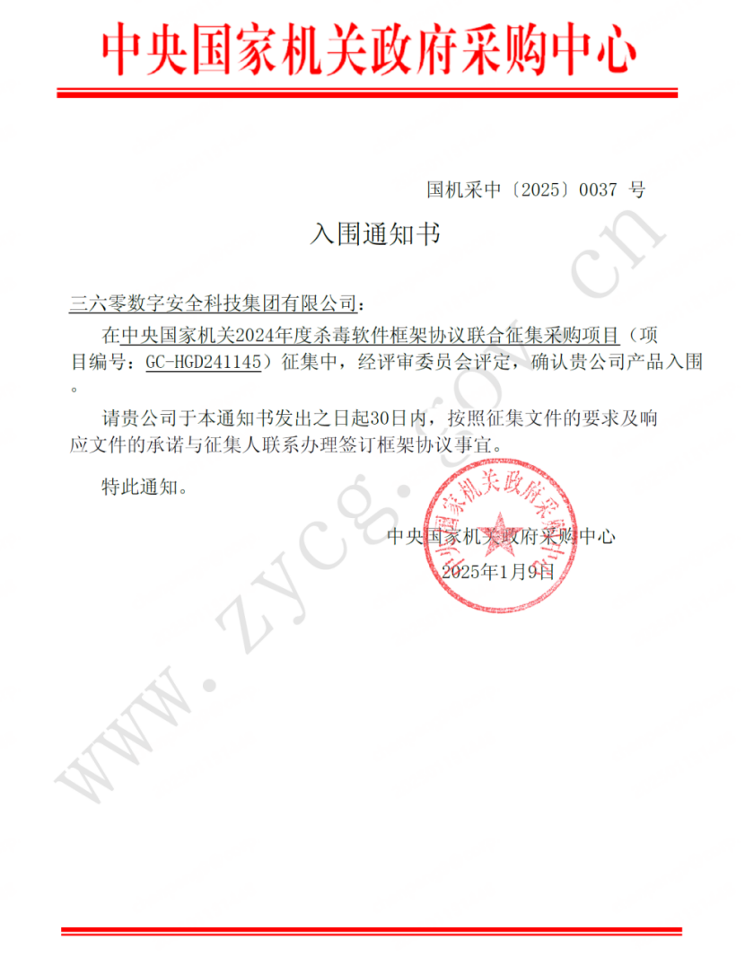 近日,中央国家机关2024年度杀毒软件框架协议联合征集采购项目入围名单正式公布。360数字安全集团凭借360终端安全管理系统的领先技术优势成功入围,充分体现了政府部门对于360数字安全集团自主研发实力、实战能力与创新实践的高度认可。