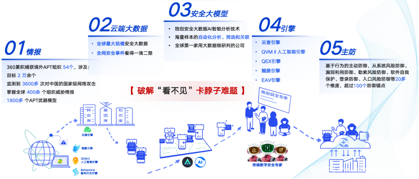 作为国内唯一兼具人工智能和数字安全能力的公司,360基于过去20年实战经验,构建了“看见+处置”为核心的数字安全运营服务体系,打造出数字安全中国方案。