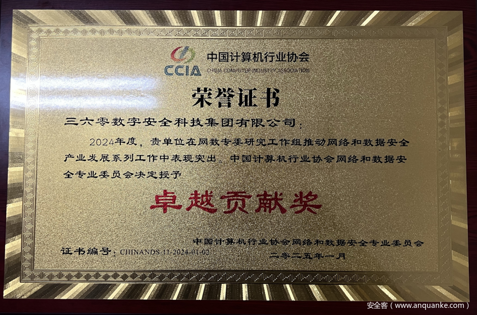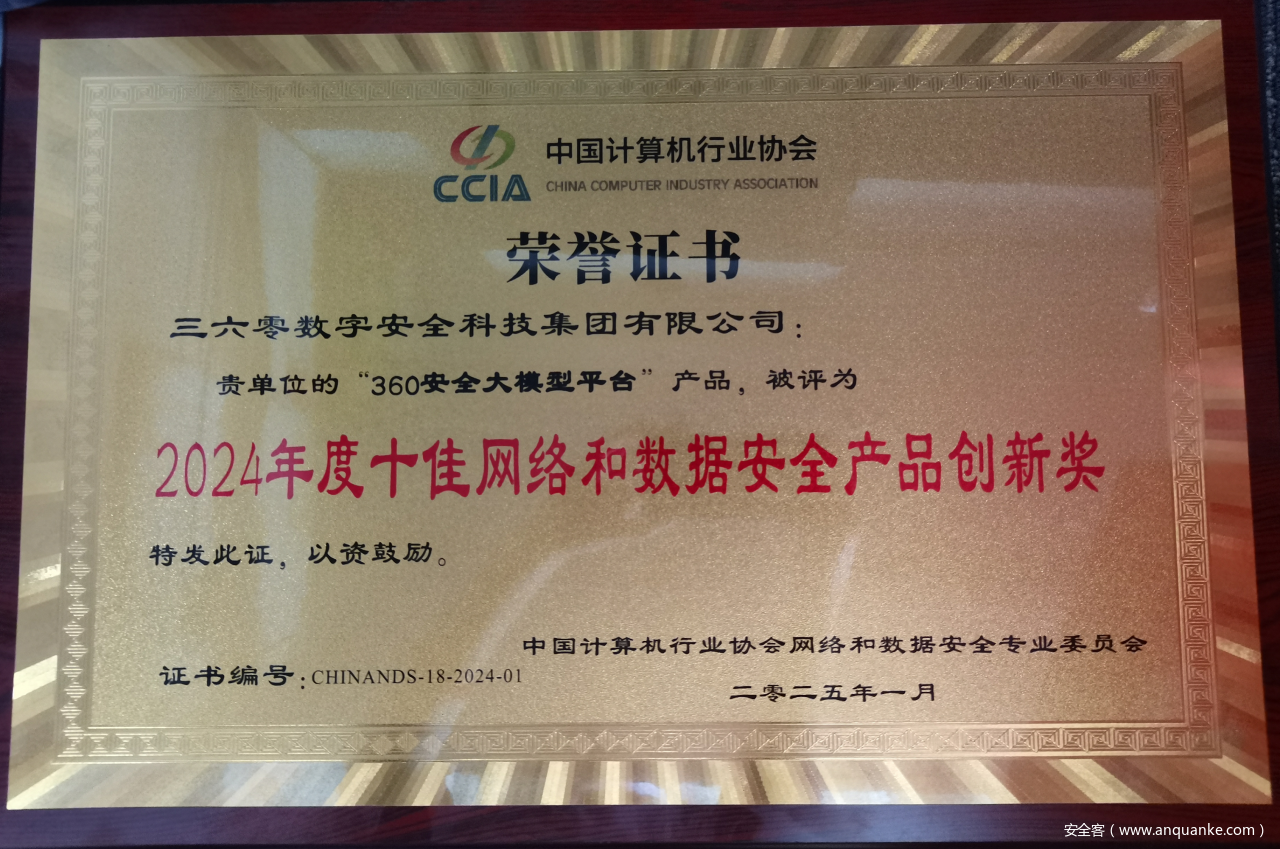 近日,中国计算机行业协会网络和数据安全专业委员会(以下简称“网数专委”)2024年度工作总结会在京召开。360数字安全集团积极参与网数专委年度各项工作,荣获“卓越贡献奖”,360安全大模型凭借领先的技术优势和创新能力,获“2024年度十佳网络和数据安全产品创新奖”。