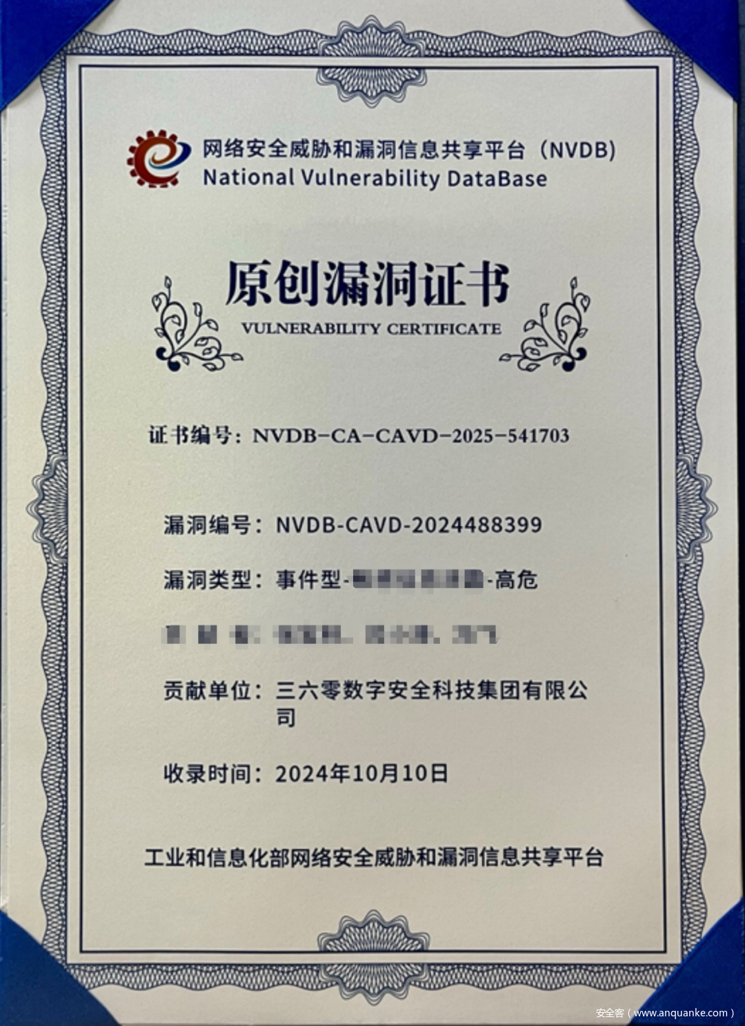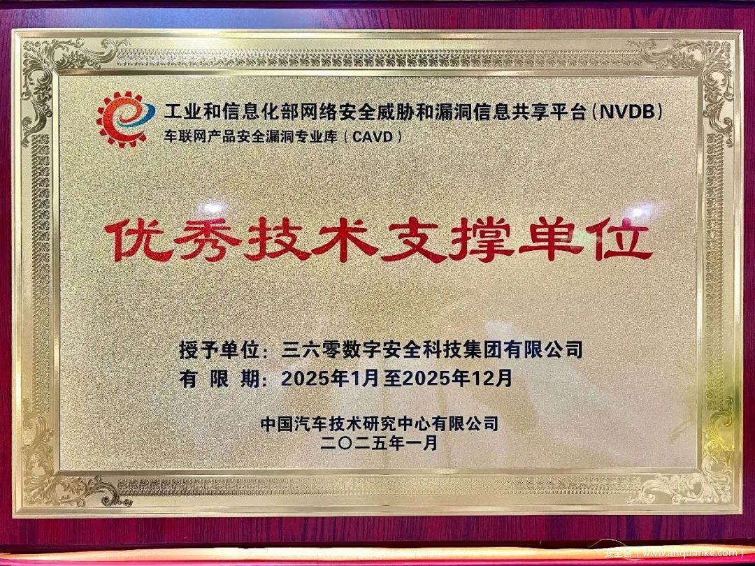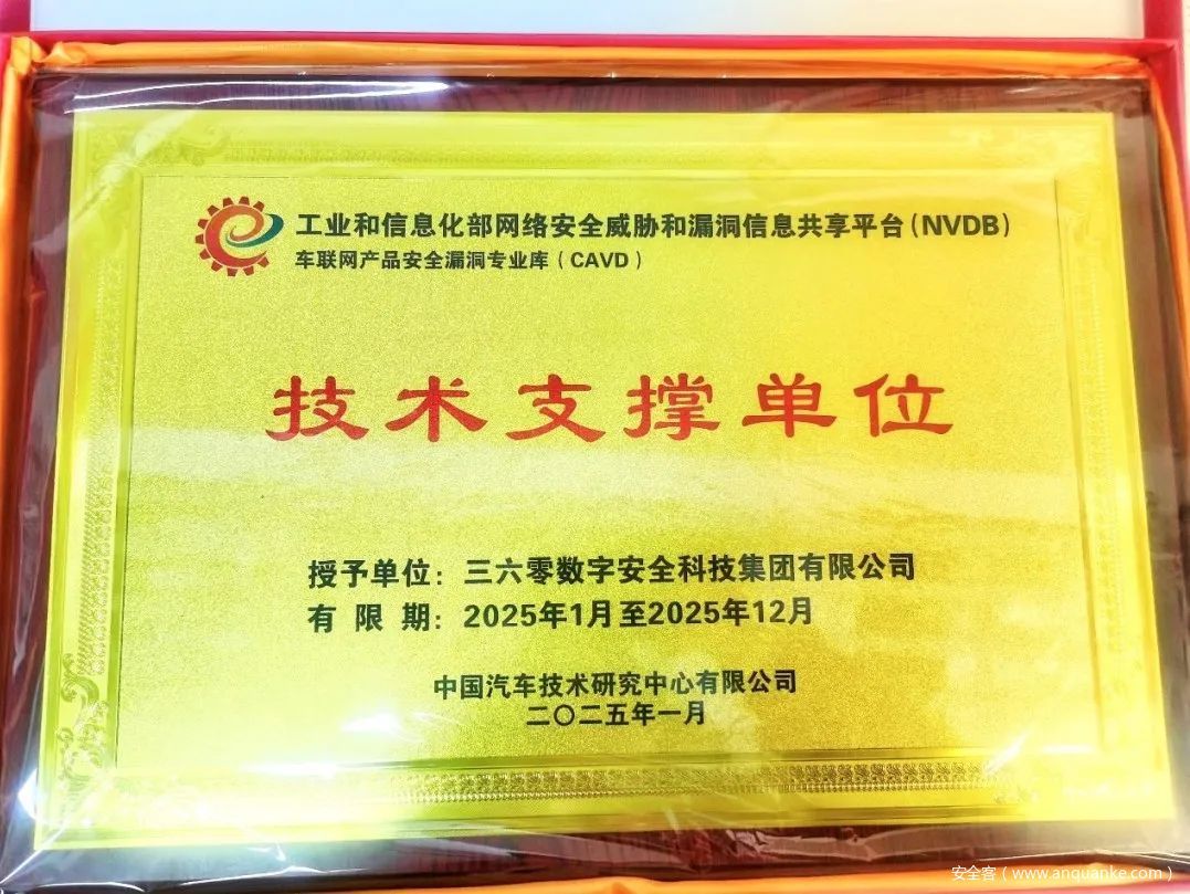 近日,由中汽数据有限公司主办的车联网产品安全漏洞专业库(NVDB-CAVD)2024年终总结会在北京圆满落幕。360数字安全集团受邀出席,荣获工业和信息化网络安全威胁和漏洞信息共享平台车联网产品安全漏洞专业库的“优秀技术支撑单位”、“技术支撑单位”称号,并获得“原创漏洞证书”。