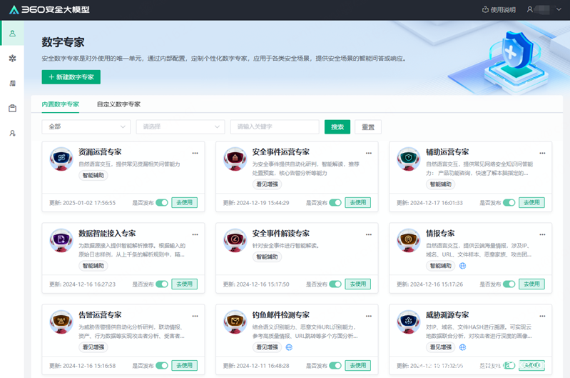 在安全智能体应用方面,360聚焦自动化威胁狩猎、深度分析研判、威胁攻击溯源、钓鱼邮件检测等领域进行专项训练,推出100+安全数字专家,帮助企业进行针对性安全防护能力提升,低成本、高效率地实现24小时不间断安全守护。