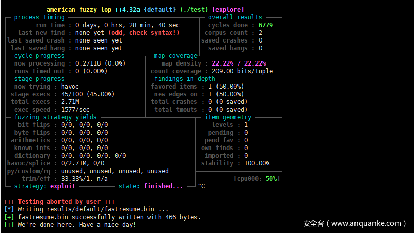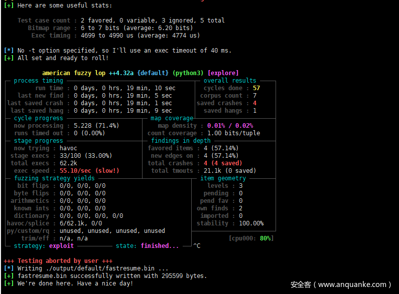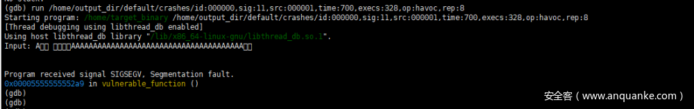 (2) afl-clang-fast 编译:可能禁用了某些安全机制,以便更好地进行模糊测试,因此程序可能不会立即终止,或者不会输出栈溢出错误。