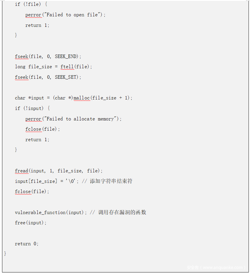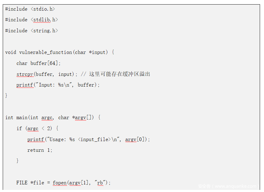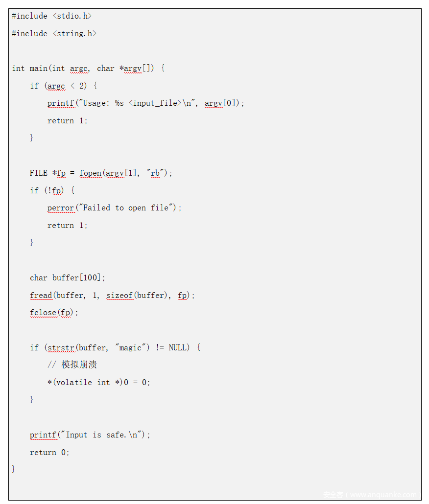使用 gcc 编译二进制文件,模拟无源码二进制文件进行模糊测试。测试程序如上 2.1.1
