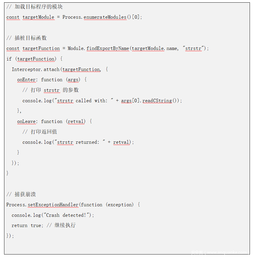 是一种基于动态插桩的模糊测试模式,它利用 Frida 工具对目标程序进行插桩,从而实现对闭源程序的模糊测试。Frida 模式特别适合测试没有源代码的程序(如移动端应用、桌面端应用等 JavaScript、Android 应用、加密保护或反调试的程序)。