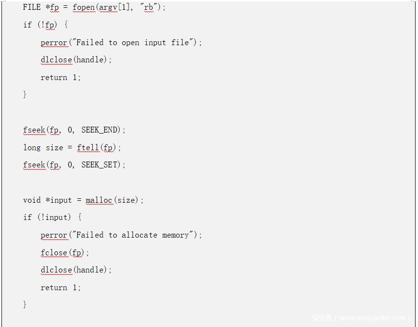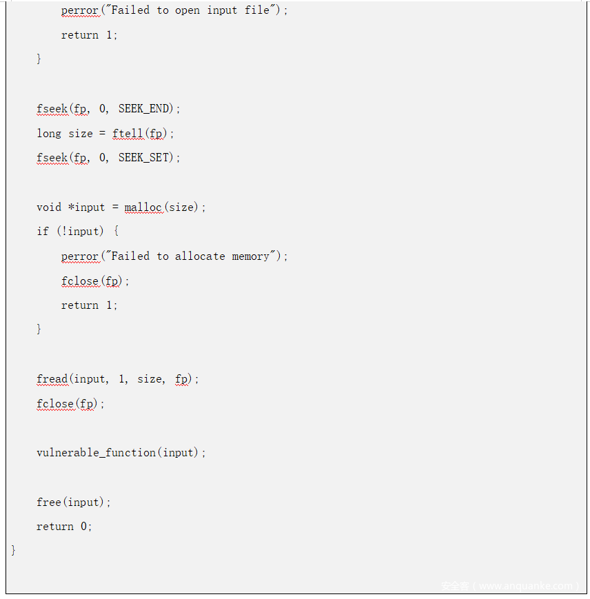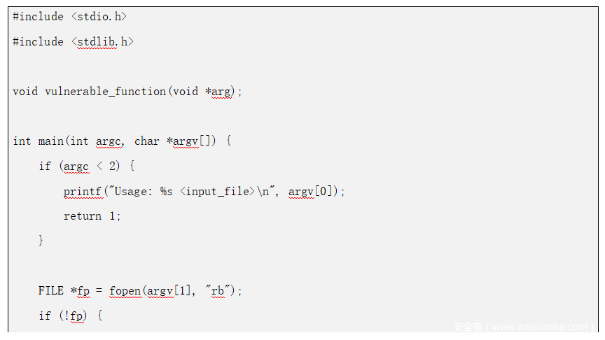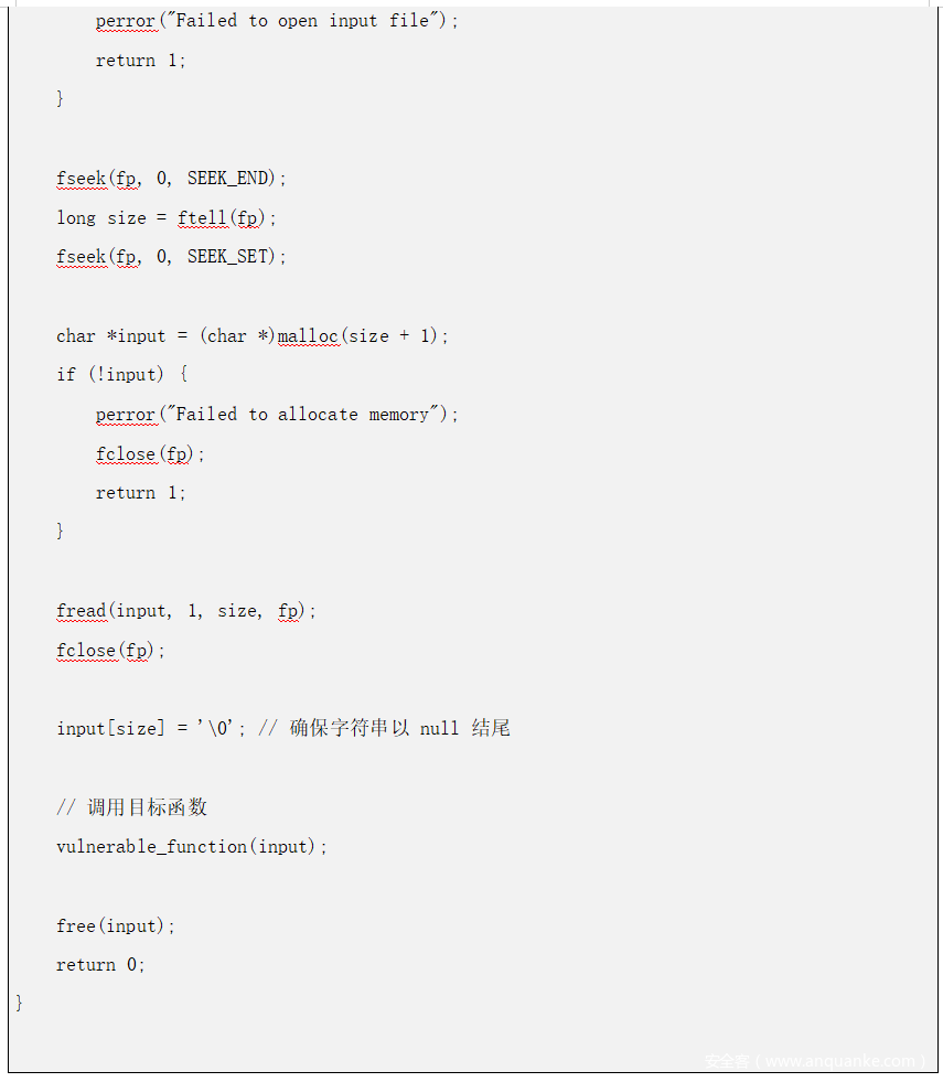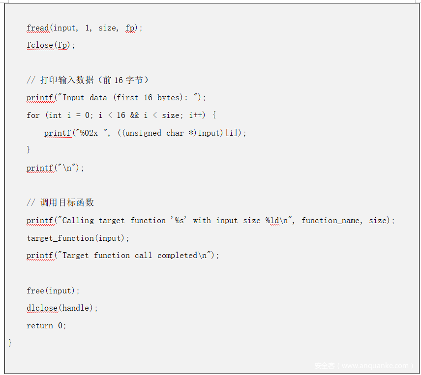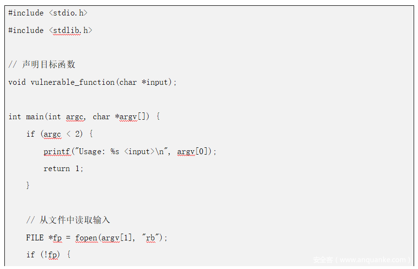 由于二进制文件不可直接运行,编写一个测试驱动(harness)来调用目标函数。创建一个文件 harness.c: