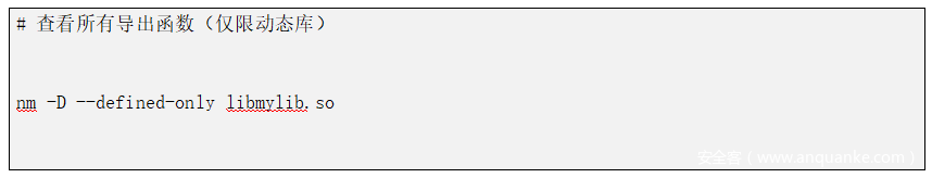可以列出共享库中的符号表(包括函数名、地址、类型等),但无法直接显示完整的函数签名(参数类型和返回值)