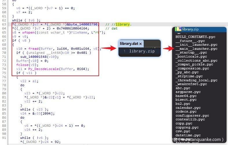 该样本的主程序使用了python的cx_Freeze模块进行打包,启动后首先会读取配置文件library.dat中所指向的压缩包,并获取压缩包中的pyc文件(编译过后的python脚本):