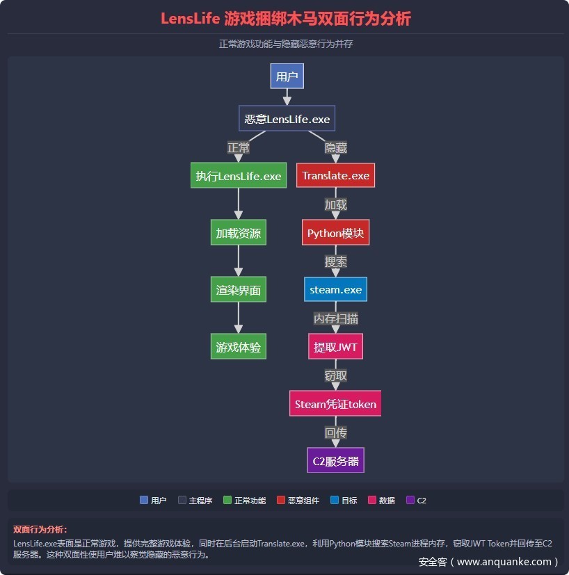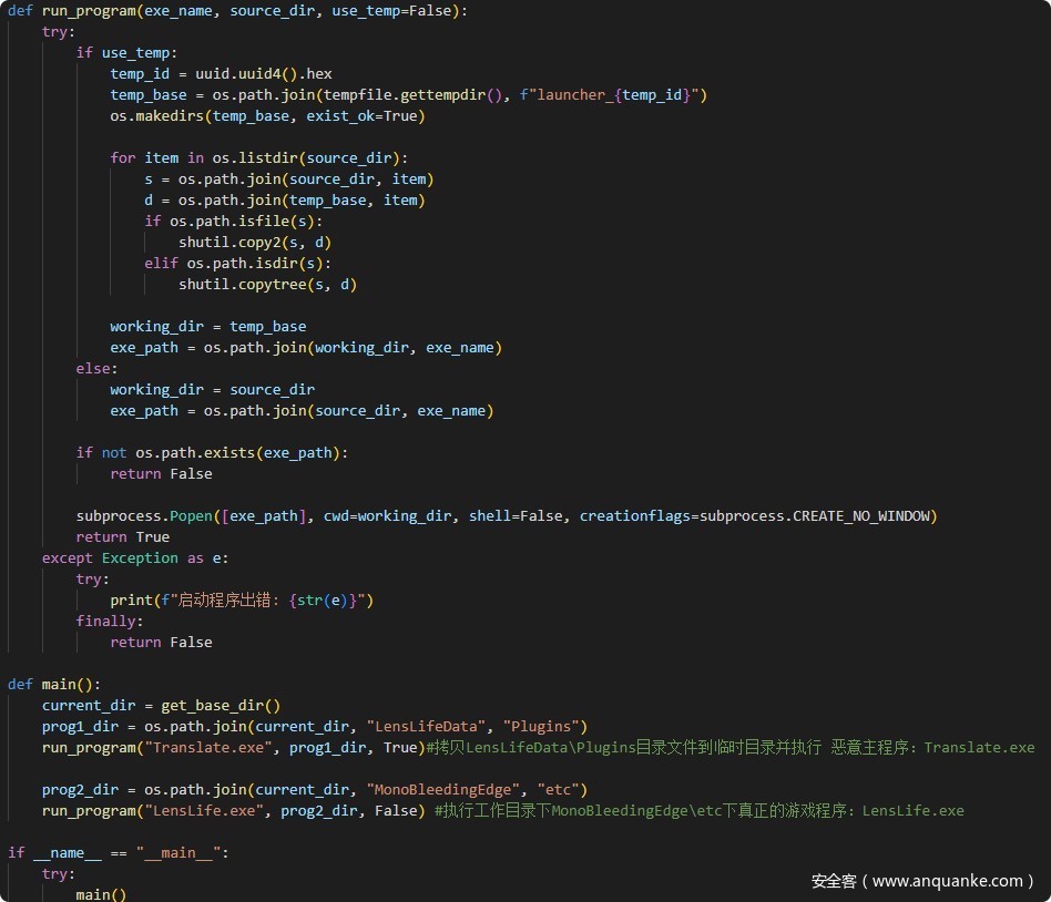 将这些pyc文件反编译成可阅读的python代码并进行分析,发现其主要功能为:拷贝执行加载器程序Translate.exe以及正常游戏程序LensLife.exe。而此时执行的这个Translate.exe加载器是由cx_Freeze打包的加载器,其功能取决于加载的library.dat配置文件中所指向的pyc脚本内容。该样本加载了带有恶意代码的pyc文件,由于加载器本身并无恶意而加载的载荷又为pyc脚本,因此其行为可能会绕过一些安全软件的防护功能。