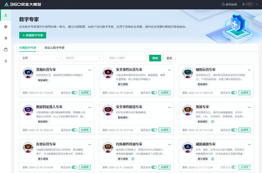 360提出用AI重塑安全并推出首个AI实战应用的安全行业大模型:360安全大模型,在安全智能体方面,聚焦自动化威胁狩猎、深度分析研判、威胁攻击溯源、钓鱼邮件检测等领域进行专项训练,推出100+安全数字专家,帮助企业进行针对性安全防护能力提升,低成本、高效率地实现24小时不间断安全守护。