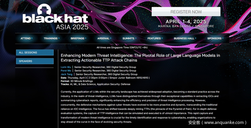 近日,Black Hat Asia 2025(亚洲黑帽大会)在新加坡举办。作为网络安全行业久负盛名的系列活动,Black hat聚焦先进安全研究、发展和趋势,以其强技术性、权威性和客观性引领未来安全思想和技术走向。360数字安全集团专家受邀以《大语言模型在提取可操作的TTP攻击链中发挥的关键作用》为题发表演讲,深入分享了360基于大模型在TTP攻击链的提炼、检测和评估方面取得的突破性进展。