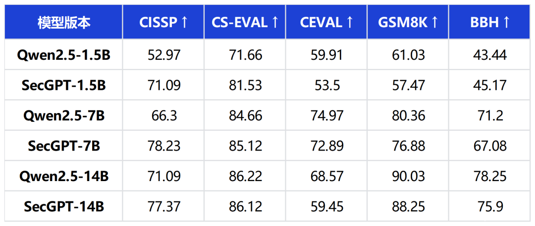 l在CISSP和CS-EVAL等安全类数据集上,SecGPT 在所有参数规模下均表现优于Qwen2.5同规格版本;