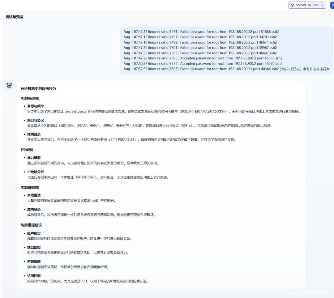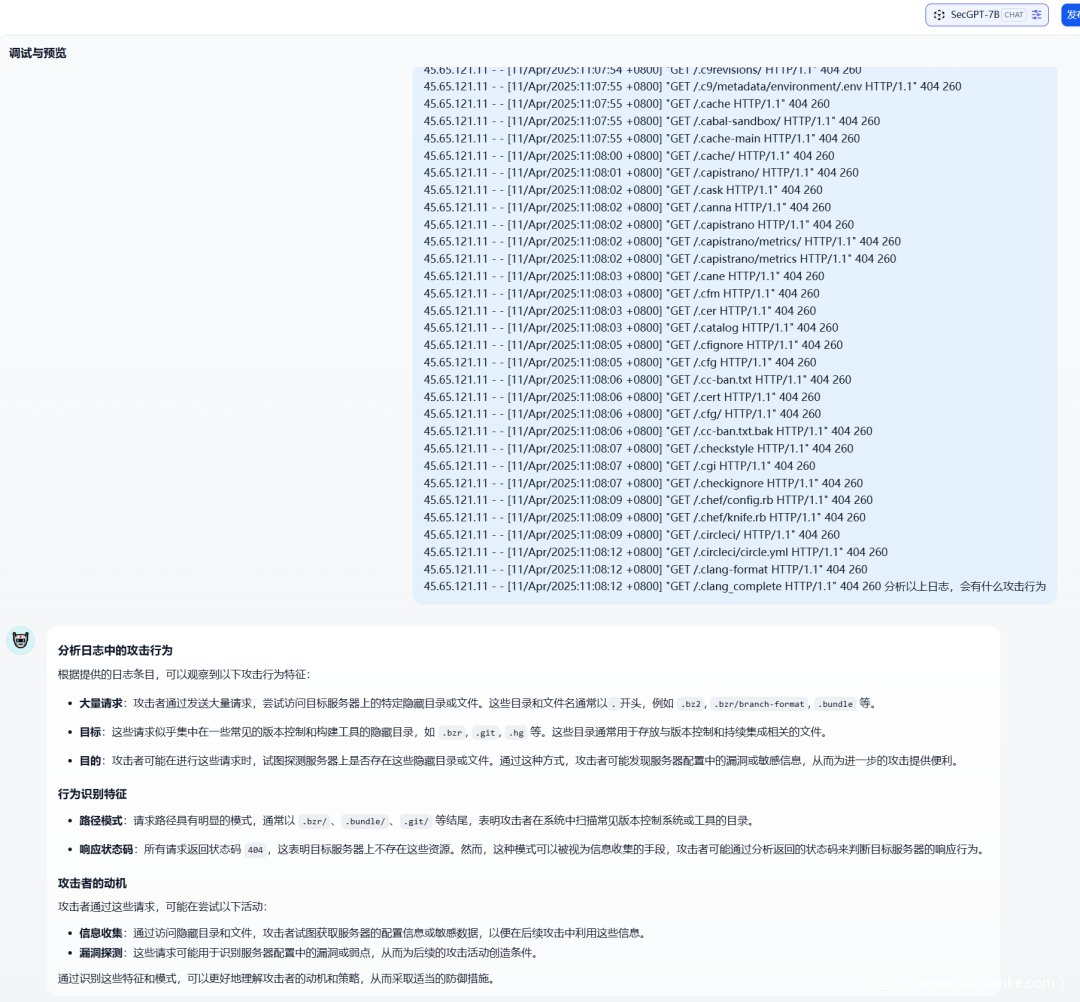 在安全日志与网络流量场景下,SecGPT 能自动识别异常事件、构建攻击链图谱、抽取关键 IOC(Indicator of Compromise),辅助完成事件溯源与告警分类。