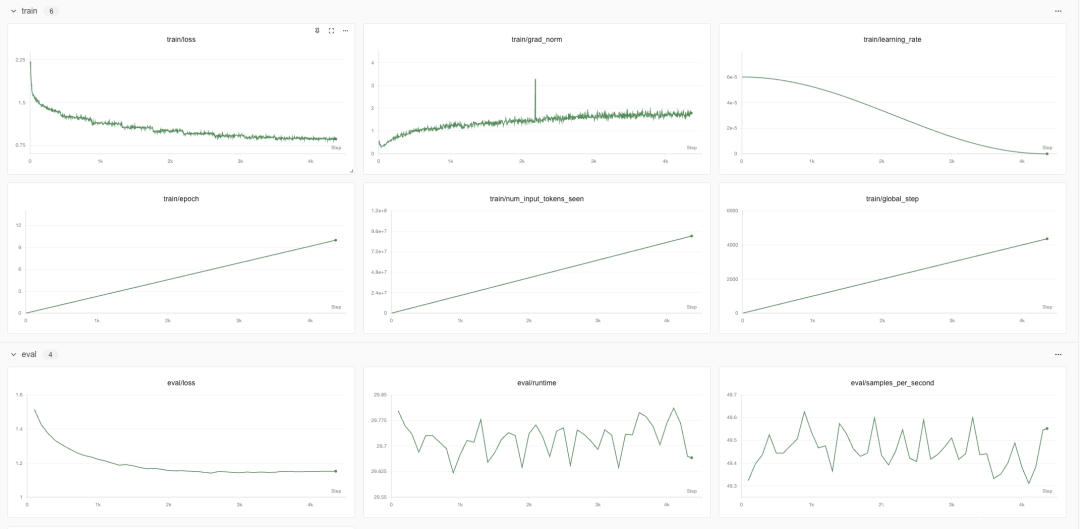 l其他指标:如训练轮数(train/epoch)、输入token 数量(train/num_input_tokens_seen)等也表明训练过程如期进行,达成预期计划。