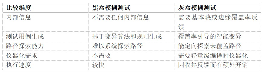 在实际的软件测试和安全评估中,选择黑盒还是灰盒模糊测试应考虑以下因素: