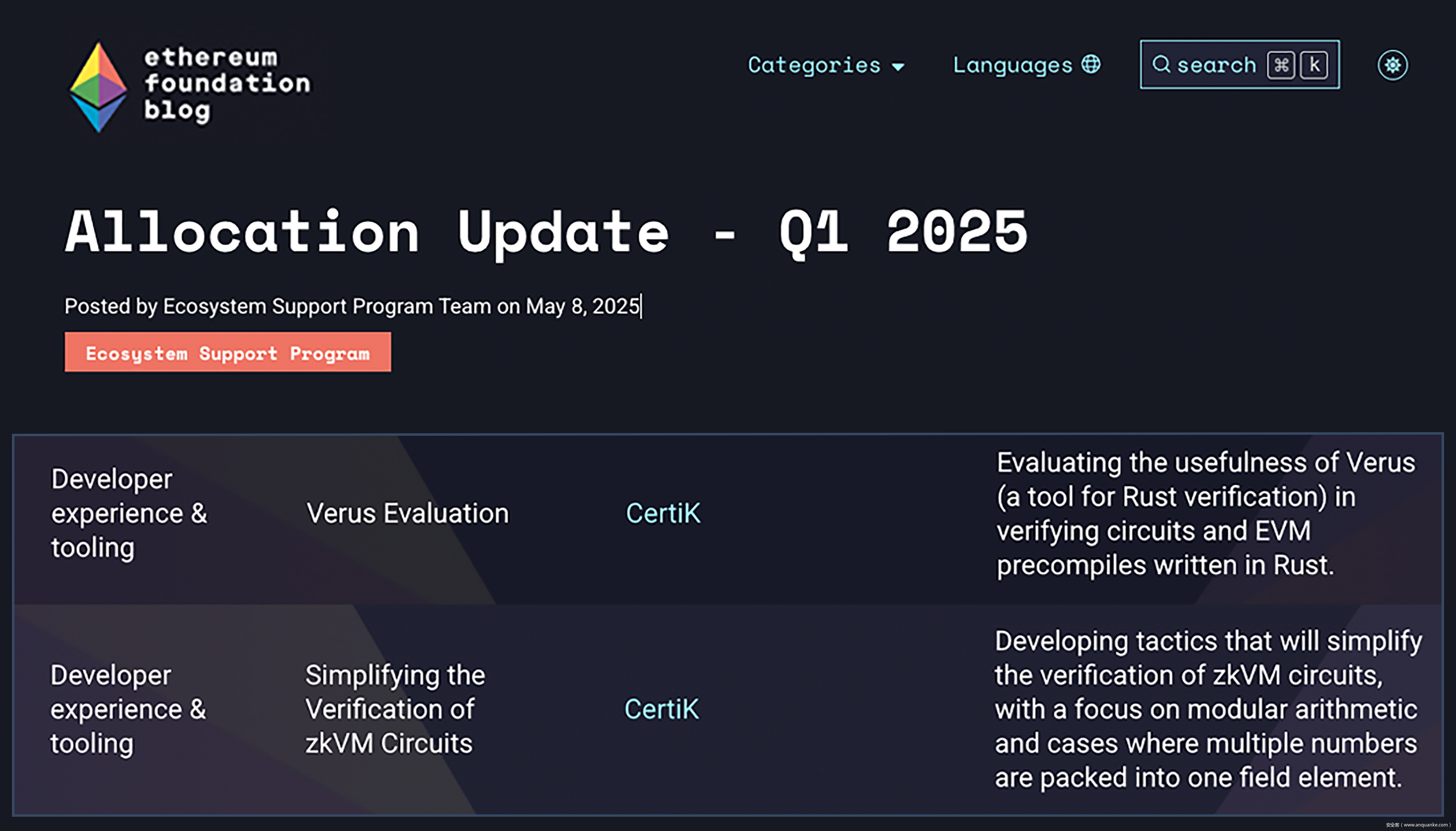 近日,以太坊基金会公布了2025年第一季度研究资助名单,全球最大的Web3.0安全公司CertiK荣获两项研究资助,源于zkEVM形式化验证竞赛。这不仅是以太坊扩展性战略的里程碑式事件,也进一步彰显了CertiK在零知识证明(ZKP)系统形式化验证领域的全球技术领导力。