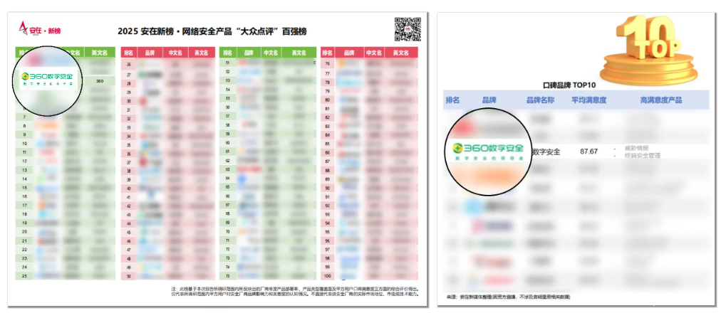 此外,报告根据对网络安全用户的调查结果,基于厂商年度产品部署率、产品类型覆盖领域数量及企业用户对其产品及服务口碑满意度三方面的综合评价得出《2025安在新榜·网络安全产品“⼤众点评”百强榜》。同时,根据用户在所有产品对品牌的满意度打分情况进行加权计算,最后梳理出年度的口碑品牌top10,360数字安全集团成为唯一入选双榜单前三甲的企业。
