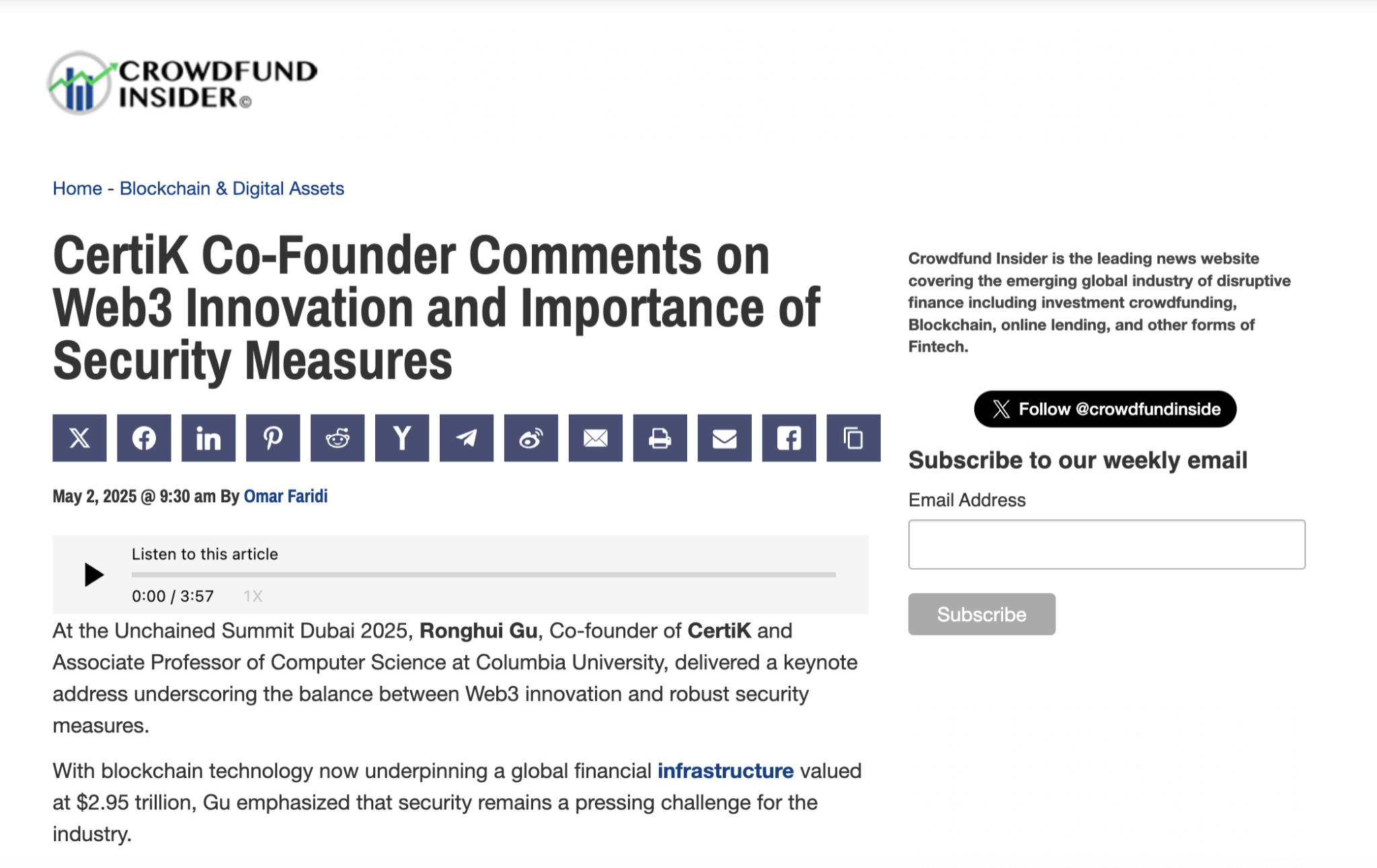 近日,权威金融科技媒体Crowdfund Insider发布报道,聚焦CertiK联合创始人兼CEO顾荣辉教授在Unchained Summit的主题演讲。报道指出,顾教授的观点揭示了Web3.0生态当前面临的挑战,以及合规与技术在推动行业可持续发展中的关键作用。