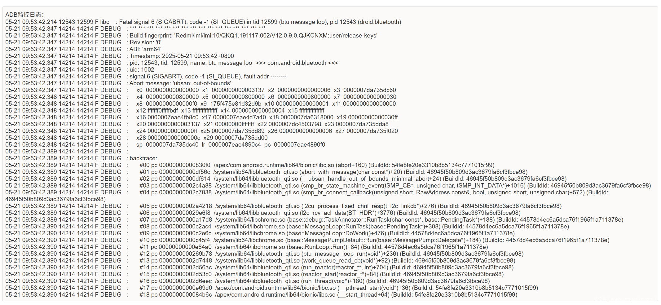 1、根据日志信息,可以看到发生了SIGABRT信号,导致蓝牙模块崩溃。具体的错误信息是”ubsan: out-of-bounds”,说明发生了数组越界的问题。