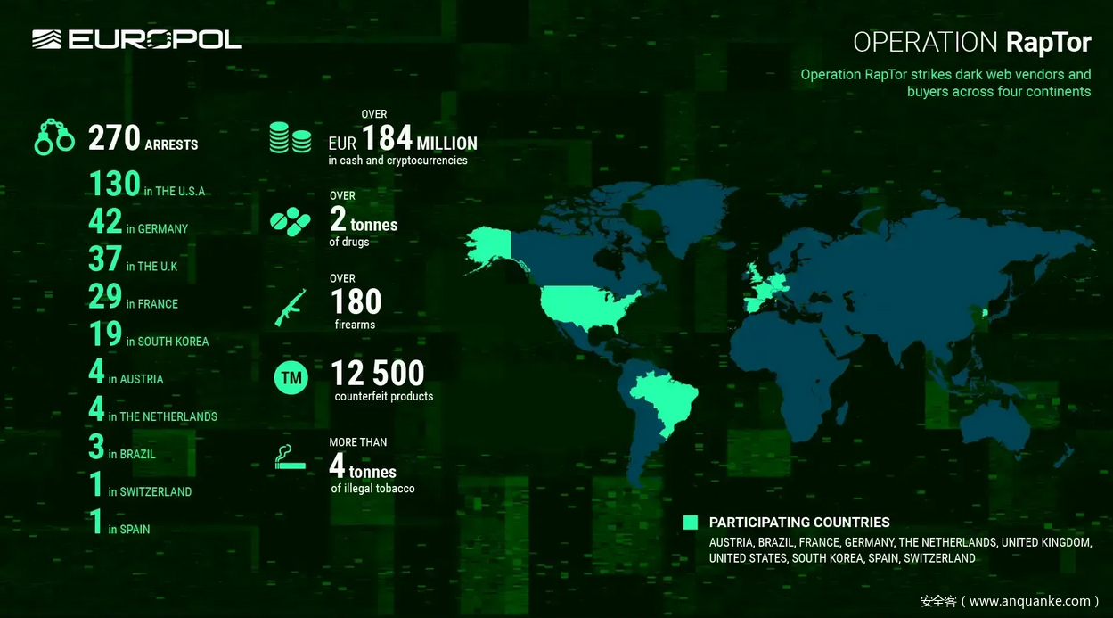 “RapTor行动表明,暗网并非超出执法部门的范围,”欧洲刑警组织欧洲网络犯罪中心负责人Edvardas Šileris说。“通过密切合作和情报共享,三大洲的官员识别并逮捕了嫌疑人,向那些认为自己可以躲在阴影中的人发出了明确的信息。