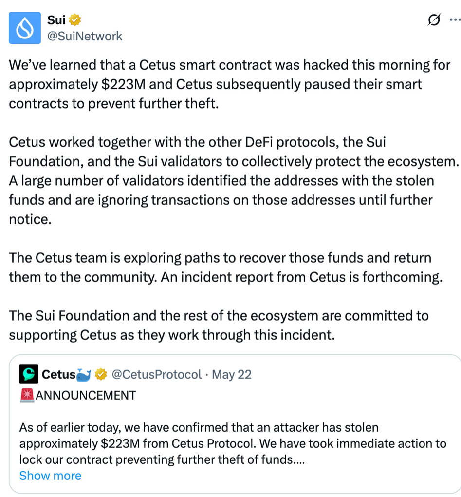 Cetus黑客事件导致2.23亿美元的用户资金被盗,其中大部分被Sui网络验证者和生态系统合作伙伴冻结。