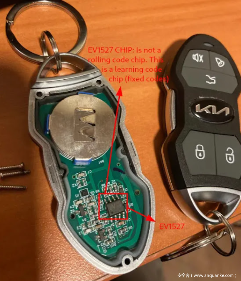 2022 年和 2023 年初的起亚厄瓜多尔车辆使用 HS2240 芯片,而 2024 年和 2025 年车型采用 EV1527 芯片,两者都实现学习代码而不是安全滚动代码。