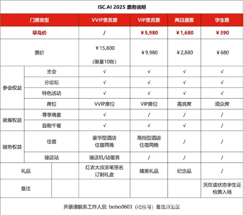 大会于6月18日推出早鸟票限量福利,即日起购买学生票(390元)、两日通票(1680元)、VIP贵宾票(5980元),均可获赠价值200元的泡泡玛特城市乐园门票,持票者可零距离接触全球顶流潮玩IP LABUBU,优先购买限定商品,并尽情享受4万平方米的沉浸式主题乐园。大会高端票种VVIP贵宾票更包含闭门晚宴、资源对接等高价值服务,为参会者构建技术交流与产业合作的双重平台,更多权益见下表: