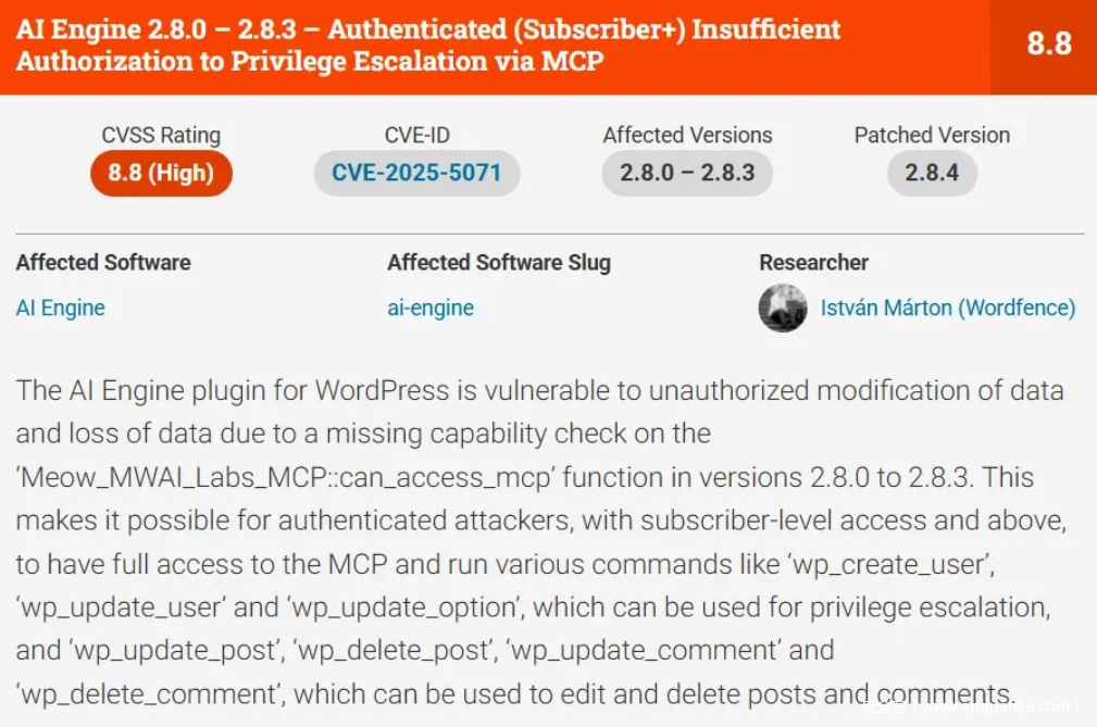 该漏洞被指定为 CVE-2025-5071,CVSS 评级高达 8.8,影响 AI 引擎插件版本 2.8.0 至 2.8.3,允许具有最低订阅者级别访问权限的经过身份验证的攻击者获得对目标 WordPress 网站的完全管理控制权。