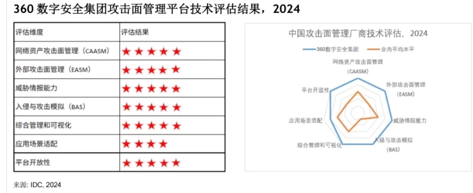 此前,在IDC《IDC Technology Assessment :中国攻击面管理厂商技术评估,2024》报告中,360攻击面管理方案在网络资产攻击面管理(CAASM)、外部攻击面管理(EASM)、威胁情报能力、入侵与攻击模拟(BAS)、综合管理和可视化、平台开放性等六项评估中获得五星满分评价。