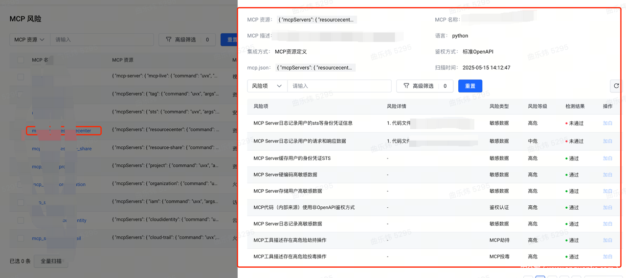 安全准入控制:确保上线到MCP Hub中的MCP Server均经过安全扫描,可覆盖5.2中七类核心安全风险,完成高危严重漏洞修复后方可上线到MCP Server Hub。