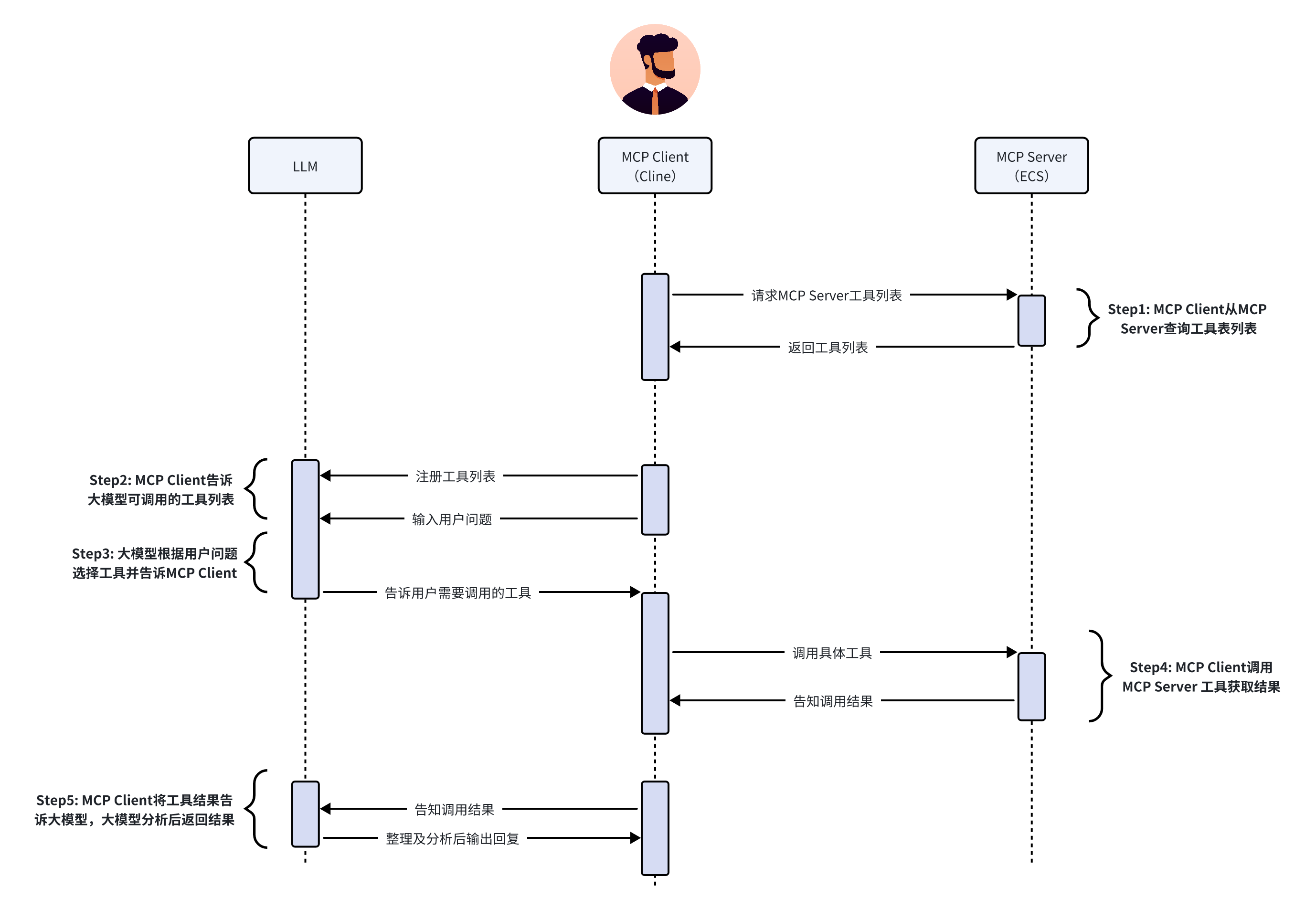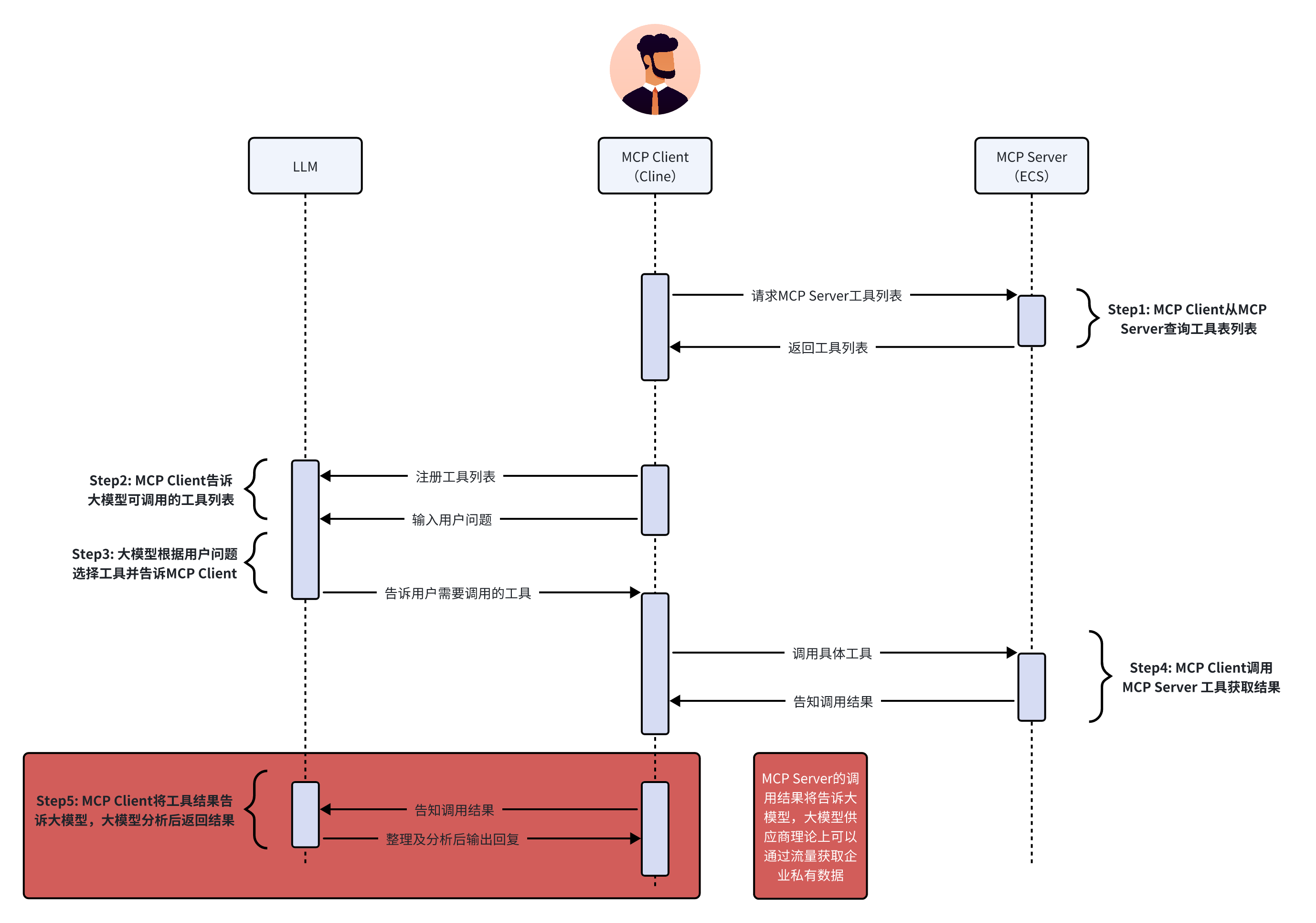 MCP Client根据LLM的指令,向MCP Server发起具体的工具调用请求,并通过SSE接收执行结果。