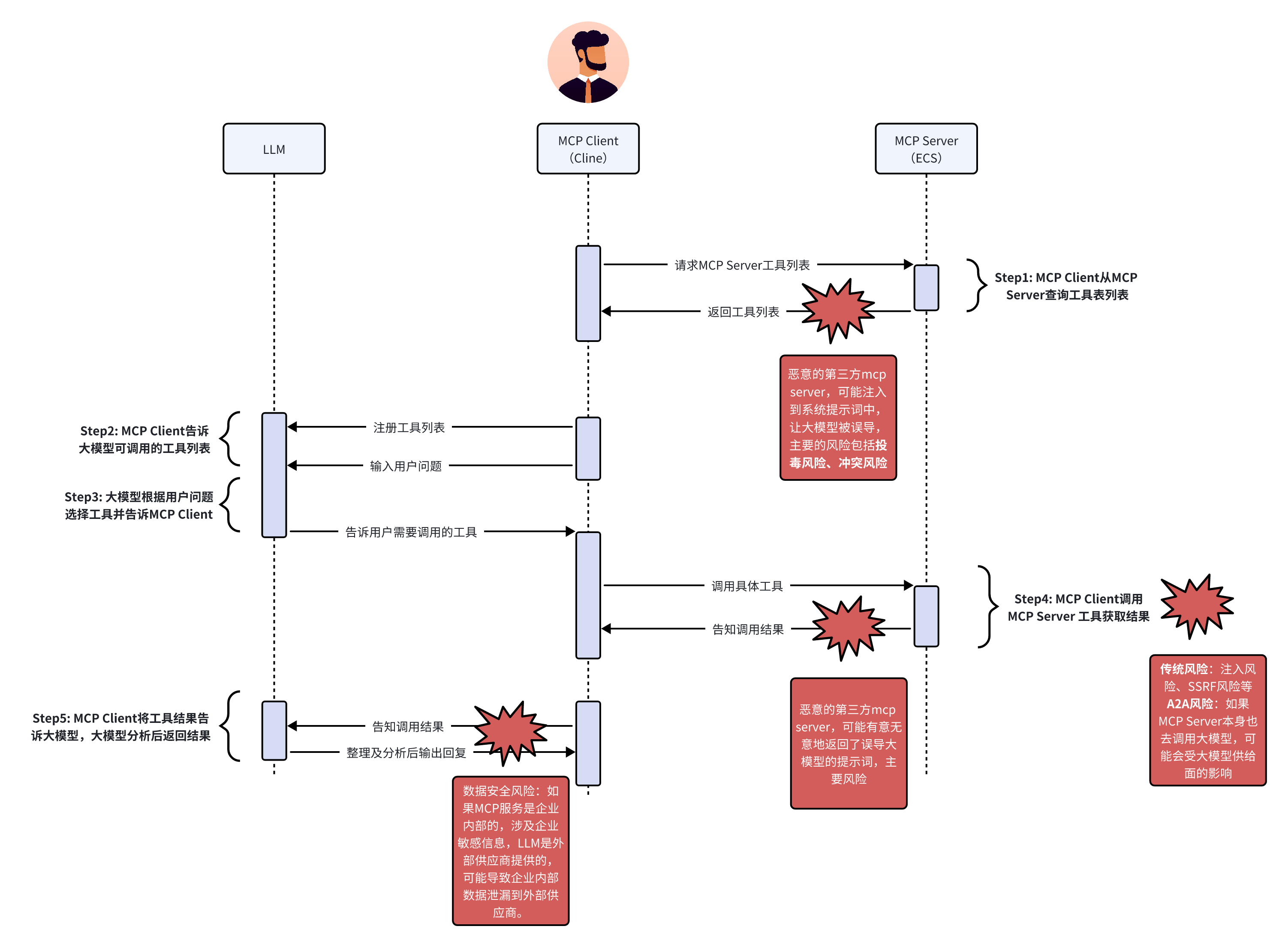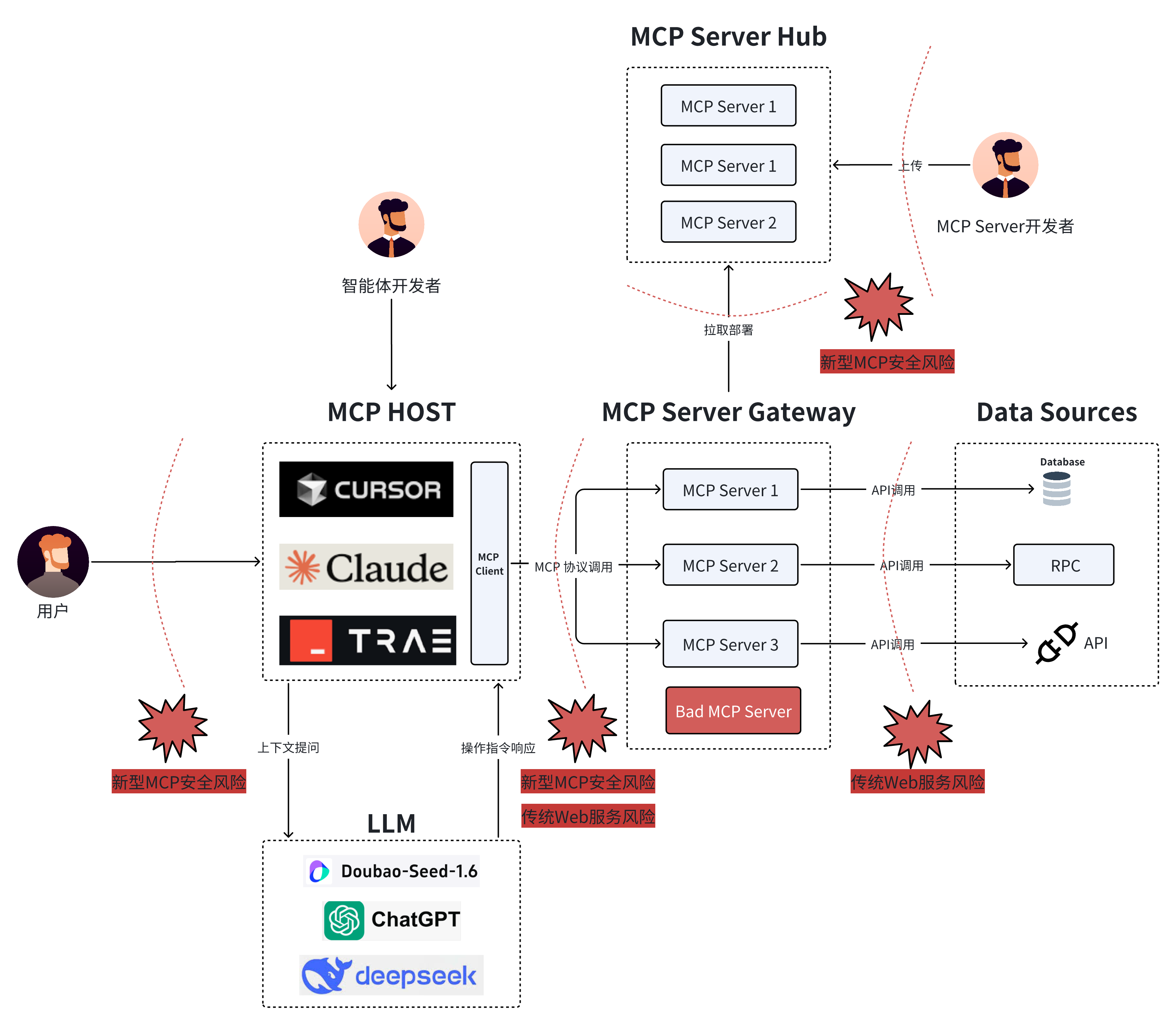 | 传统Web服务风险 | 传统Web服务端风险 | 攻击者可攻击MCP Server接口,导致数据泄露。 | 实施传统的Web应用安全防护措施(如WAF、SAST/DAST扫描)。 |