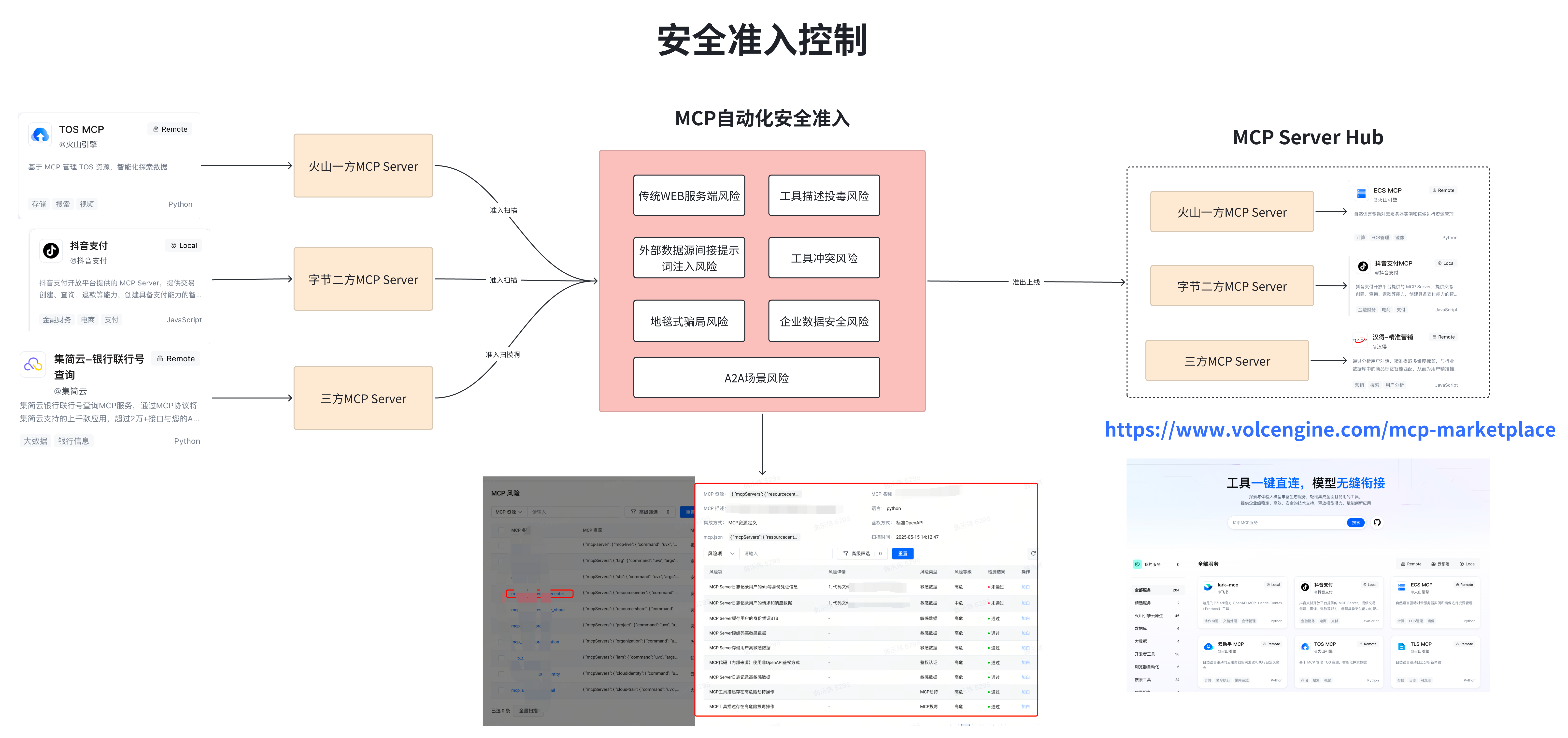 作为专注于AI云原生的公有云服务商,火山引擎具备将模型与工具深度融合的天然优势。火山于2024年5月正式上线大模型生态广场,目前已集成超过200款覆盖主流云产品的MCP Server。本文将围绕MCP的全生命周期,系统性地分享火山引擎云平台安全保障团队在MCP安全体系建设方面的实践经验,期望能为行业共同构建安全的MCP生态提供有价值的参考。