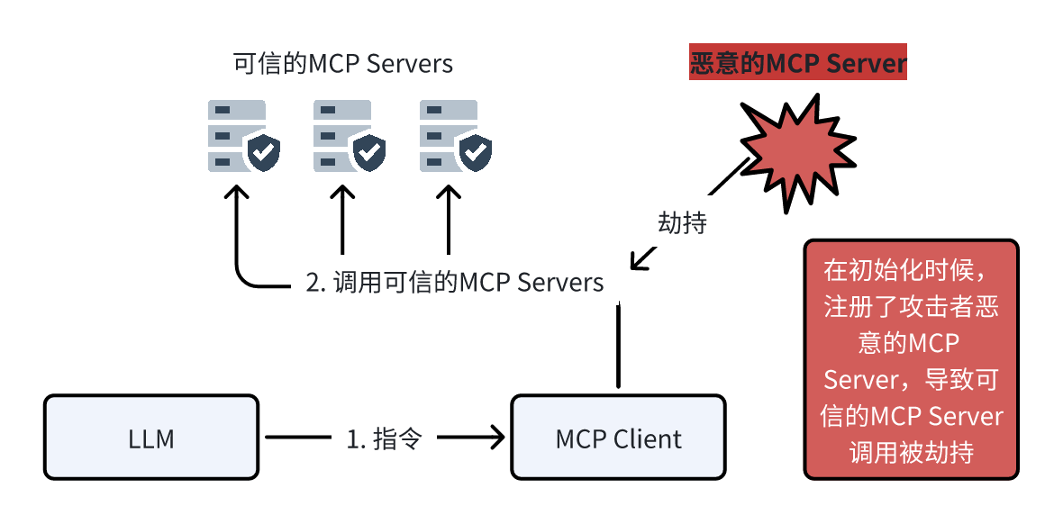 - ■ 劫持可信MCP Server:在工具描述中注入指令,导致大模型执行其他可信的MCP Server被劫持。